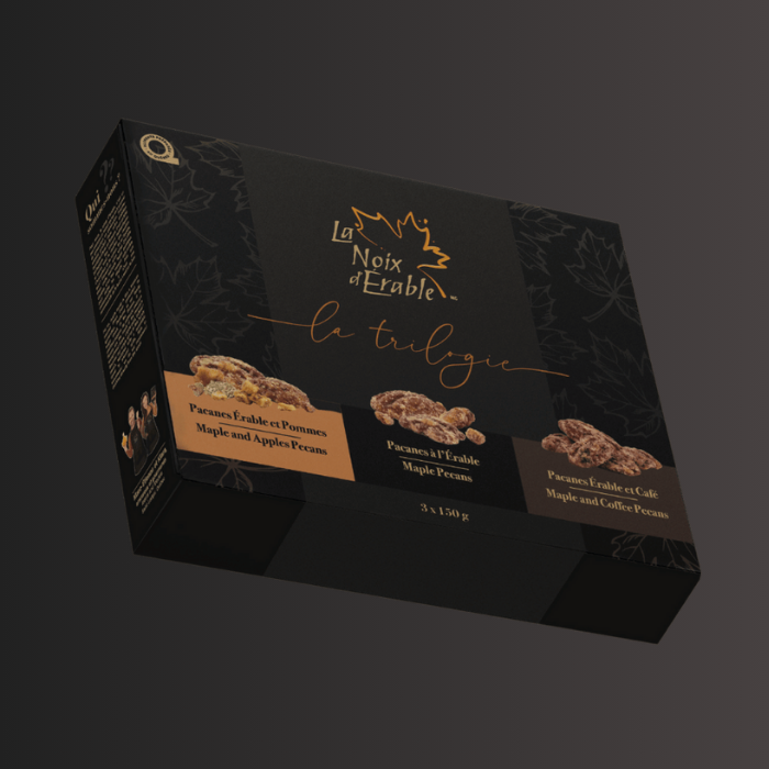 « Ça, c’est juste…écoeurant! », s’est exclamé le chanceux qui y a goûté pour la première fois. C’est ainsi qu’est née La Noix d’Érable, et depuis, notre passion ne cesse de grandir. Notre boîte trilogie vous propose nos trois sublimes créations. Les Pacanes à l’Érable combinent la douceur et le mariage parfait entre la pacane et l’érable. Les Pacanes Érable et Café unissent à merveille l’arôme du café fraîchement moulu et nos pacanes. Enfin, les Pacanes Érable et Pommes offrent un mélange gourmand de pommes, cannelle et graines de citrouille, enrobé de sirop d’érable. Réalisées avec les coulées d’exception de notre érablière familiale, nos créations sont le fruit de notre amour et de notre savoir-faire. On vous met au défi de ne pas ouvrir les trois sacs...!